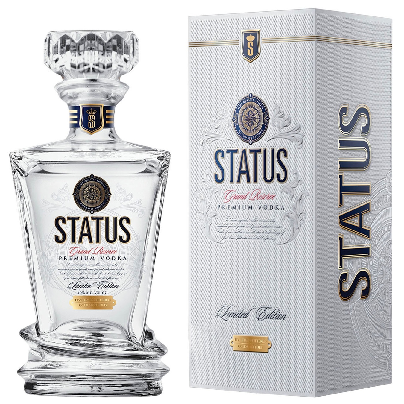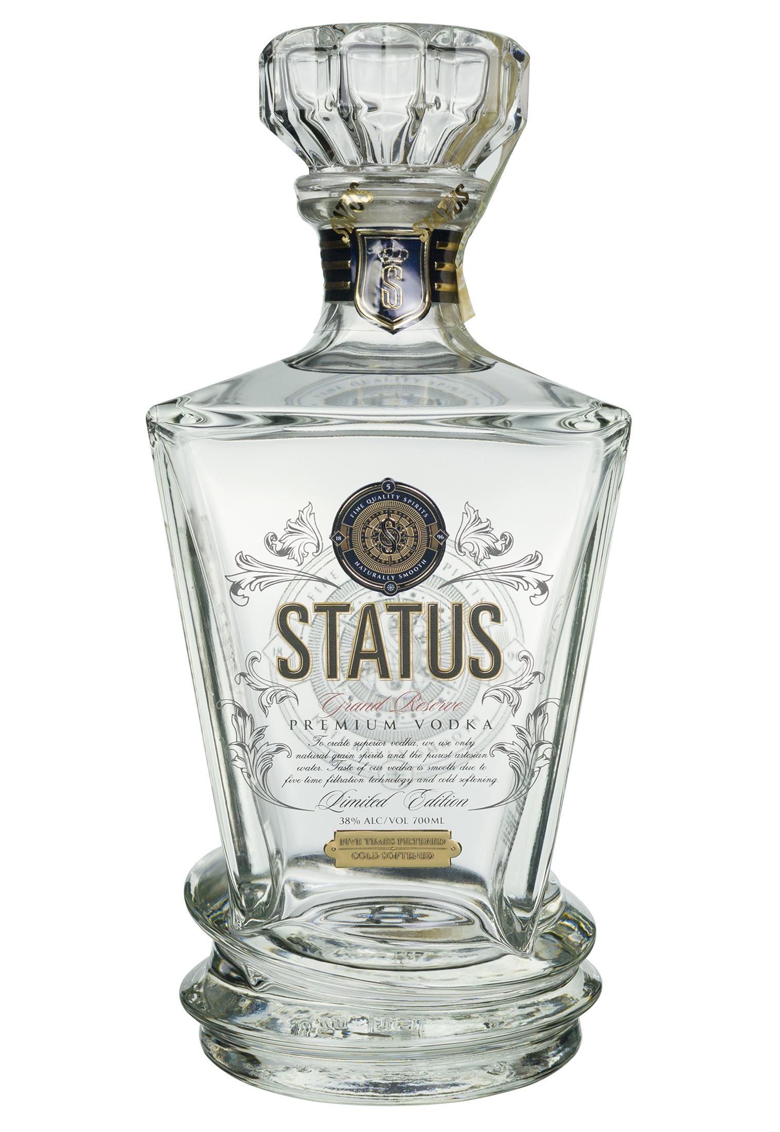 Водка Status Grand Reserve – подготвена вода със златни йони, ретифициран алкохол клас „лукс“, овкусяване бадем и екстракт от стафиди, мек послевкус , изискана напитка за ценители